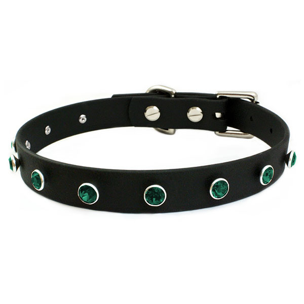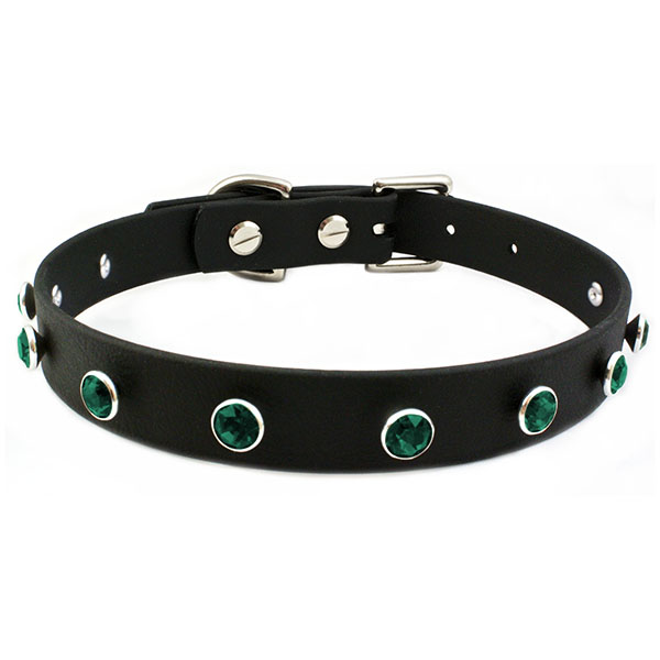 Get your ghoul on with this classic and comfortable 19mm wide collar in black vegan leather embellished with 10 genuine Emerald Green Swarovski® crystals, alternative bling at its finest!
