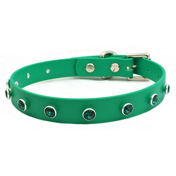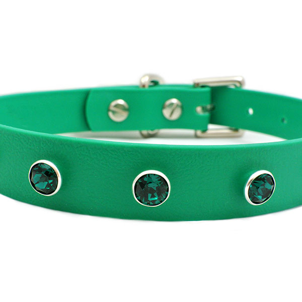 With 10 Swarovski® emerald green crystals this 19mm wide green BioThane collar has a matt look finish with an embossed leather look texture.